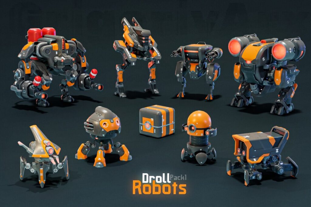 Droll Robots Pack1:9 種類の多彩なロボットと攻撃アクションを収録した 3D キャラクター素材集
